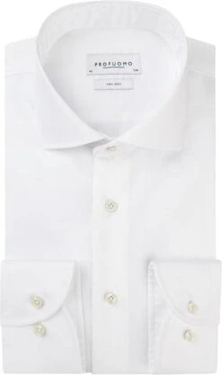 Kom stijlvol voor de dag met dit wit overhemd van Profuomo. Met de cutaway kraag en Slim-Fit pasvorm geef je je outfit een professionele uitstraling zonder daarvoor een stropdas te dragen. Het overhemd is gemaakt van strijkvrij katoen en is geweven in een platbinding. Hierdoor is het licht van gewicht is en comfortabel om te dragen. De witte knopen geven het shirt een verzorgde en strakke look.